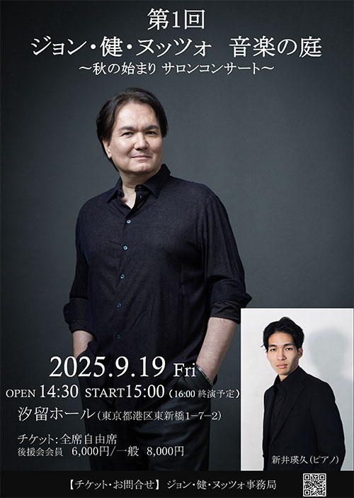 第1回 ジョン・健・ヌッツォ 音楽の庭 〜秋の始まり サロンコンサート〜 公演情報 日時 2025年9月19日(金)15時開演(14時半開場/16時終演予定) 会場 汐留ホール(東京都港区東新橋) 出演 ジョン・健・ヌッツォ、新井瑛久(pf) チケット 席種・料金(税込) 全席自由席 後援会会員 6,000円/一般 8,000円 ※会員ご本人様に限ります チケット取り扱い ジョン ・健・ヌッツォ事務局