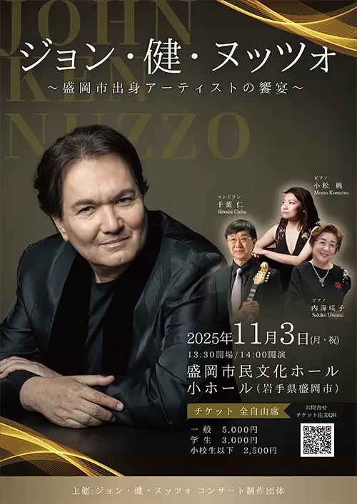 ジョン・健・ヌッツォ 〜盛岡出身アーティストとの響宴〜 公演情報 日時 2025年11月3日(祝・月)14:00開演(13:30開場) 会場 盛岡市民文化ホール 小ホール(岩手県盛岡市) 出演 ジョン・健・ヌッツォ、千葉仁(マンドリン) 内海咲子(pf)、小松桃(Pf) チケット 席種・料金(税込) 一般5,000円 学生3,000円 小学生以下2,500円 チケット取り扱い プレイガイド インフォメーション 主催 ジョン・健・ヌッツォ コンサート制作団体