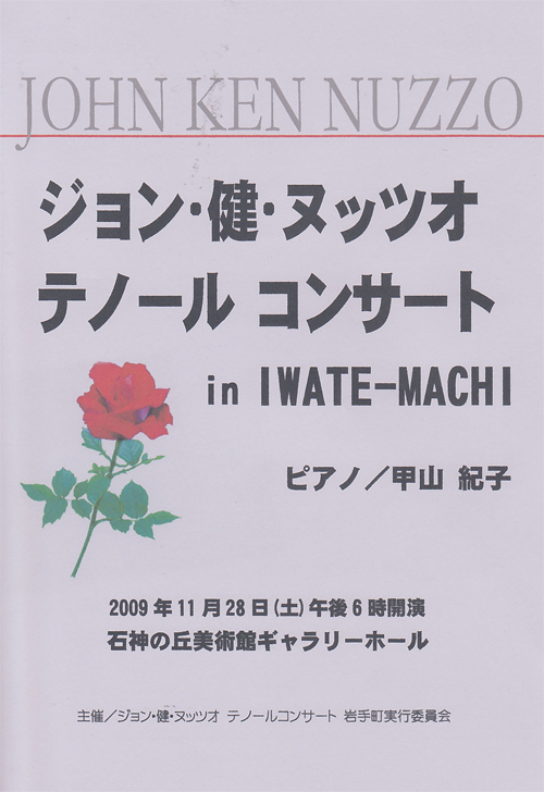 John Ken Nuzzo Recital Iwate Performance Information Date/Time November 28,2009(Sun) Venue Ishigami-no-oka Museum of Art(Itsukaichi, Iwate Machi,Iwat gun,Iwate Prefecture) Iwate Performance Information Date/Time November 29, 2009(Sat) Venue Morioka Grand Hotel(Aigo, Morioka City, Iwate Prefecture)
